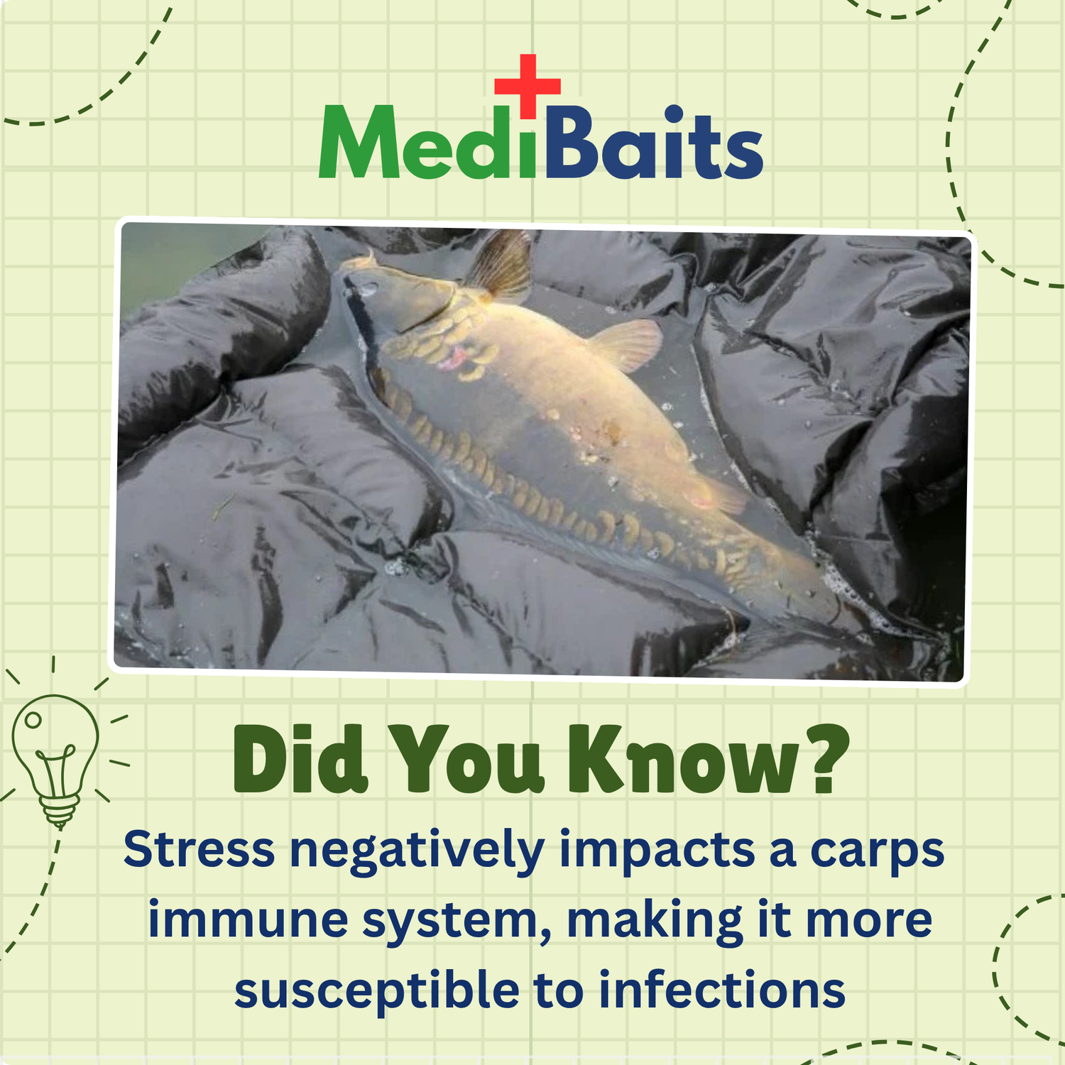 When carp experience stress, from being caught, temperature changes, overcrowding, or poor water quality, their immune response is suppressed. This leaves them vulnerable to parasites and bacterial infections. Reducing stress and supporting recovery with balanced, medicated nutrition helps the immune system rebound and heal faster, protecting the fish from long-term damage.